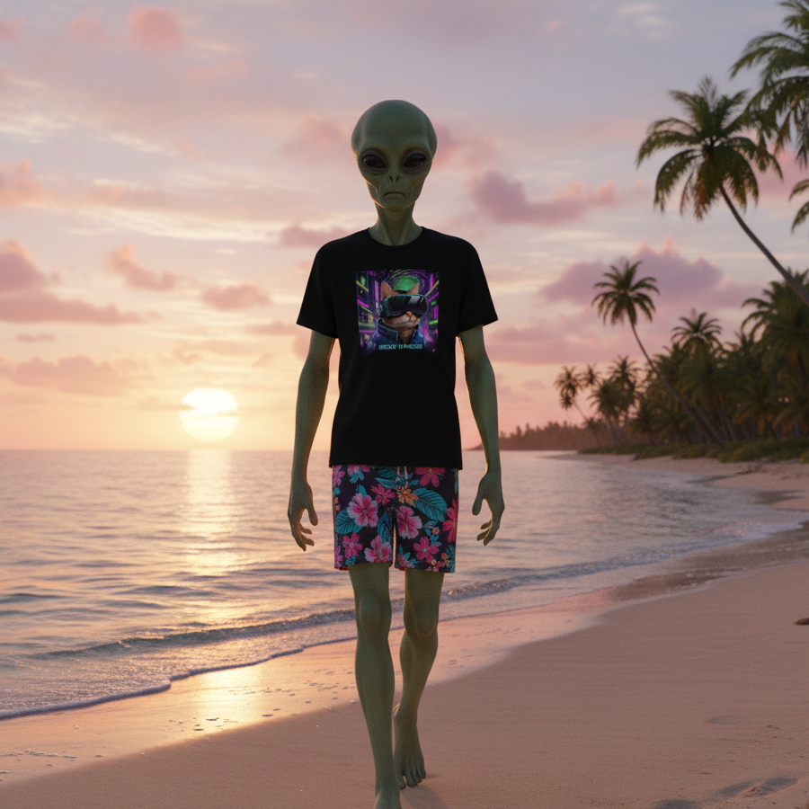 Forget laser pointers—this feline's chasing galaxies. The Meow Ranger Tee features a cyber-enhanced cat who's clearly seen the metaverse... and judged it. Rocking VR goggles, a glow-up tech jacket, and that signature “I run this planet” cat confidence, this shirt is equal parts streetwear and space-opera.